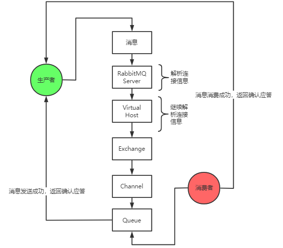 第五步,待消息进入到对应的消息队列中之后,RabbitMQ Server 会返回给我们一个确认应答(确认应答后续会进行介绍),来通知我们,消息已经成功被 RabbitMQ Server 所发送,于是,消费者便会根据一定的策略来从消息队列中获取消费,并最终将该消息消费掉,消息消费之后,也会给我们返回一个确认应答(确认应答后续会进行介绍),告诉我们消息已经成功消费掉了。