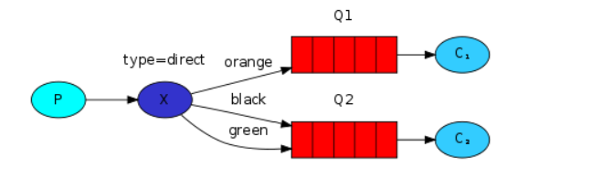 orange、black、green 分别表示不同的两个 routing key ,orange 这一个 key 绑定了一个队列,black、green、两个不同的 key 也绑定了一个队列,这种现象就是直接模式的第一种业务场景,单 key 绑定。