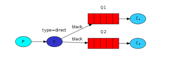 在图中我们可以看到,Q1、Q2 两个队列,分别绑定到了 routing key 均为 black 的 direct 交换机上,即名称相同的一个 key 绑定到了多个队列上面,这种现象被称为多重 key 绑定。