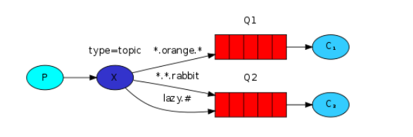 主题模式对 routing key 的匹配规则做了改进,上述其他四种模式中有涉及 key 匹配的地方都是完全匹配,即名称必须相等时才能把 key 匹配上,而对于主题模式,则不需要这样。