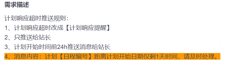 计划响应超时 -> 计划响应提醒 24h 生成站长待办的逻辑保留,同时去掉延时消息生成推送消息的逻辑 新增定时任务,查询当天第二天的计划,生成推送消息,提醒站长